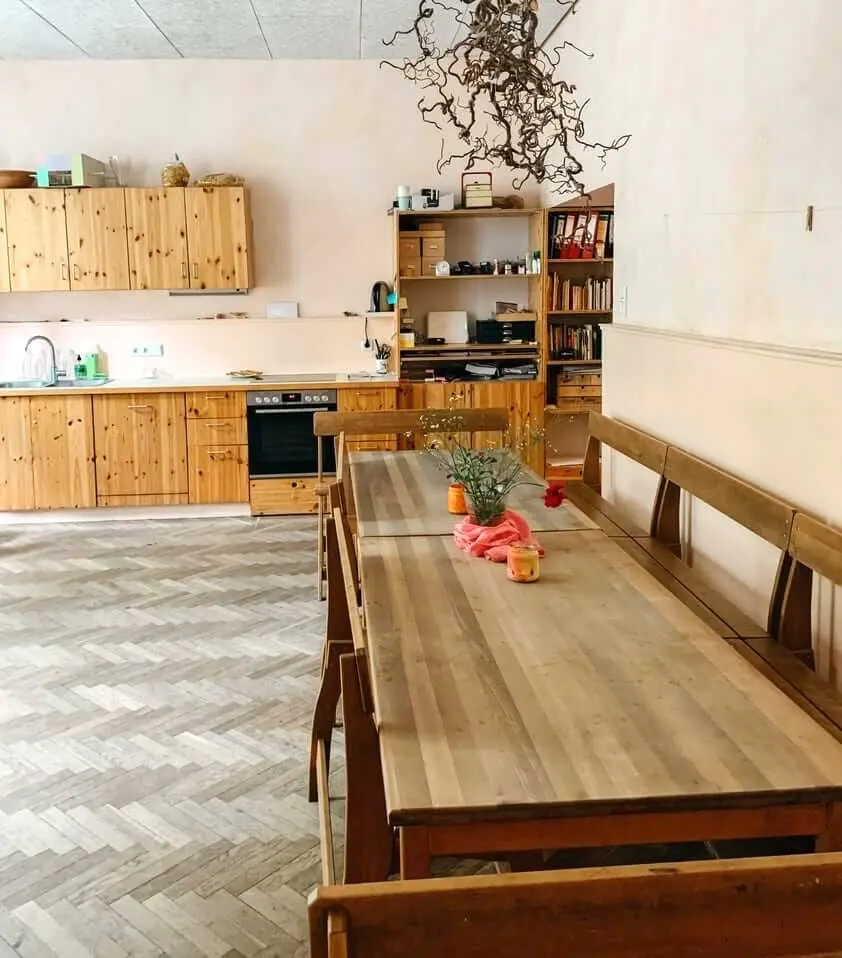 - Gruppenraum mit Küchenzeile, Ess- und Bastelbereich mit Bücherregal und Bauecke